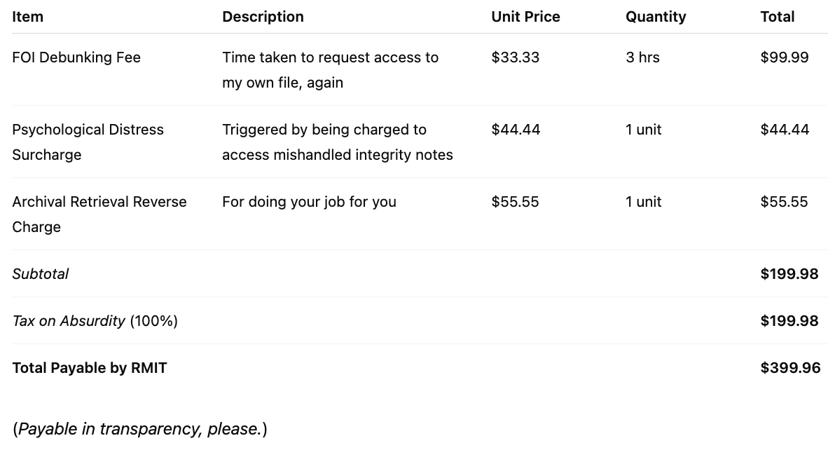 On 11 November 2025, I received a letter from RMIT’s FOI Office stating that in order to access internal documentation about how my own research integrity case was handled (Case Ref 2025.13), I’d need to pay a deposit of $126 toward an estimated $252 total cost. Why? Because it will apparently take them 10 hours to search their systems for messages, notes, or records.